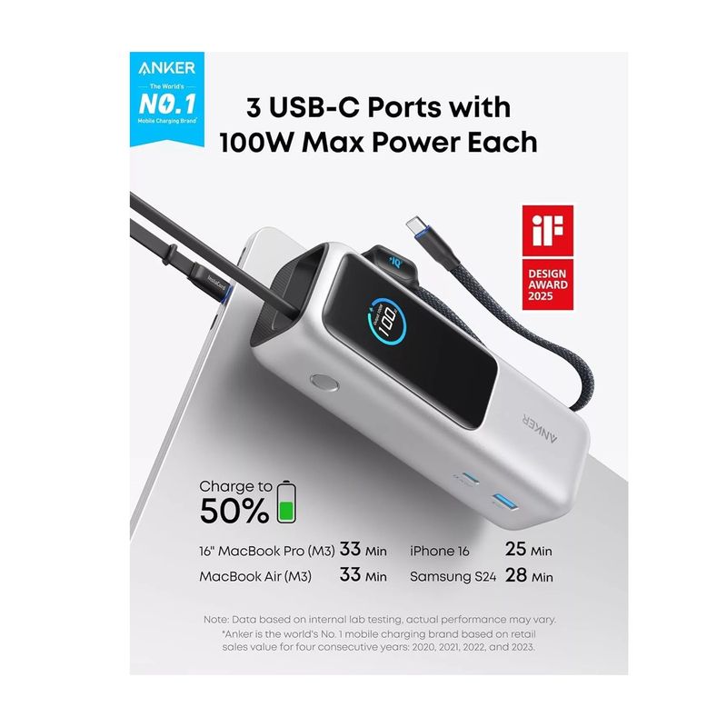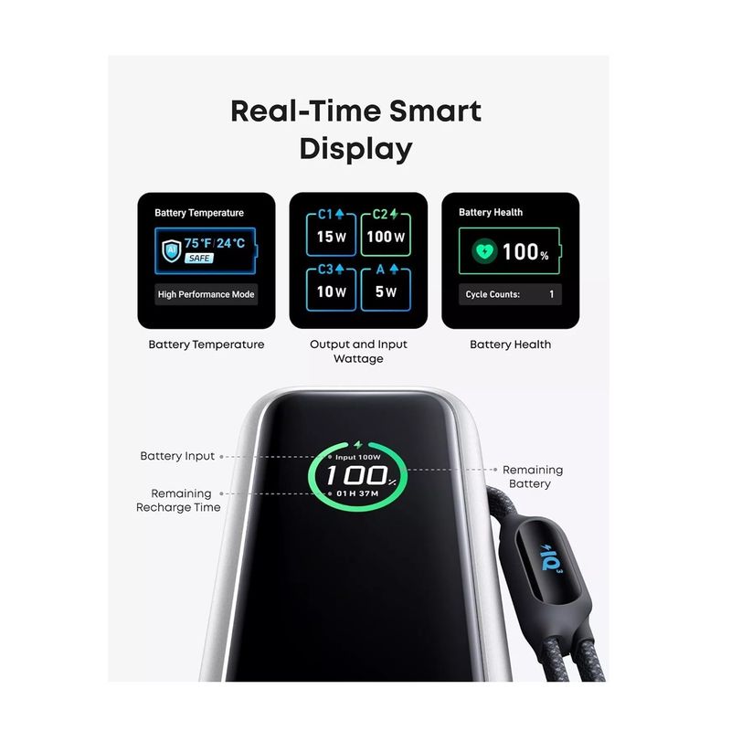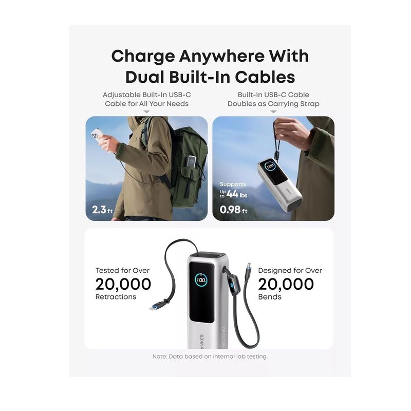 Package contains | Baterie externa Anker (25K, 165W, cabluri incorporate si retractabile) Manual de utilizare |