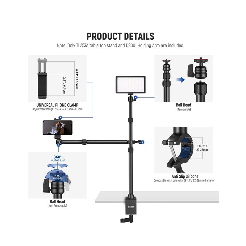 Package contains | Neewer TL253A Brat Articulat Overhead Fotografie Produs Suport de masa Brat telescopic de sustinere Suport pentru telefon Adaptor surub 1/4"-20 la 3/8"-16 Adaptor surub 1/4"-20 la 5/8"-27 , Neewer TL253A Brat Articulat Overhead Fotografie Produs Suport de masa Brat telescopic de sustinere Suport pentru telefon Adaptor surub 1/4"-20 la 3/8"-16 Adaptor surub 1/4"-20 la 5/8"-27 |