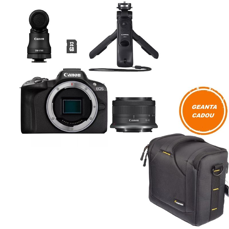 Package contains | Canon EOS R50 Baterie Canon LP-E17 Incarcator Canon LC-E17 Charger Capac Body Curea de umar Canon EM-200DB Capacul acumulatorului Capac pentru patina Obiectiv RF-S 18-45mm F4.5-6.3 IS STM Capace obiectiv fata/spate DM-E100 Microfon stereo HG-100TBR Tripod grip Card de memorie de 32 GB Protectie antivantpentru microfonul stereo Canon Telecomanda fara fir Curea de mana pentru trepied Atasament pentru microfon S Atasament pentru microfon L |