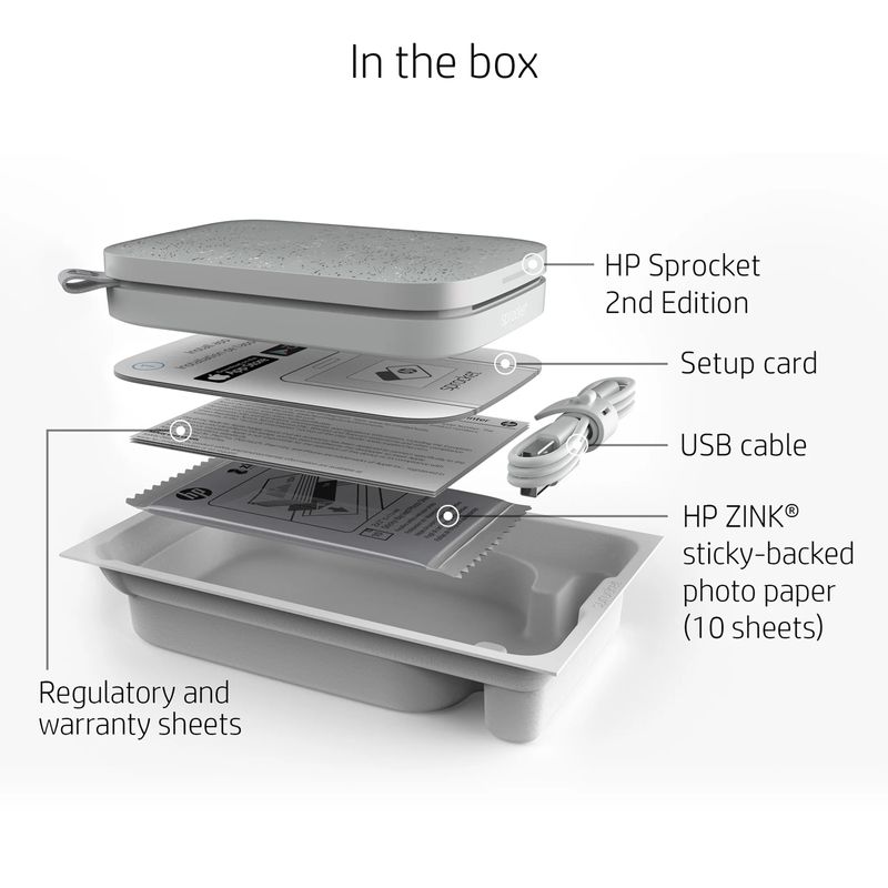 Package contains | Imprimanta foto HP Sprocket Cablu USB Hartie foto HP ZINK cu spate adeziv (10 coli) Documentatie Cablu |
