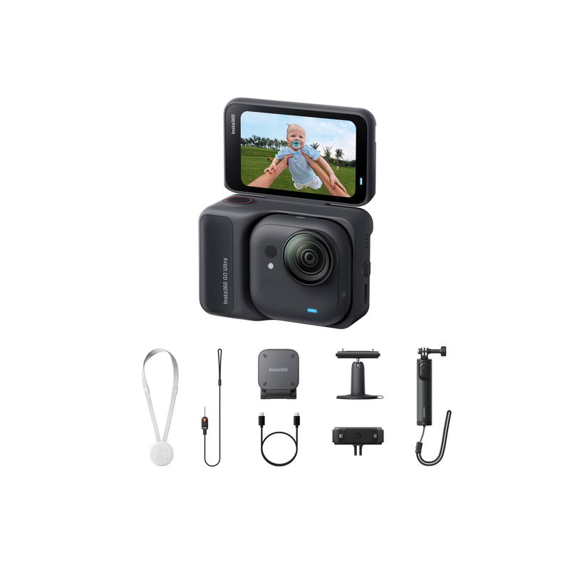 Package contains | 1 x Insta360 GO Ultra 1 x Action Pod 1 x Snur de siguranta cu eliberare rapida 1 x Clips magnetic 1 x Pandantiv magnetic 1 x Suport cu eliberare rapida 1 x Mini trepied 2-in-1 2.0 1 x Suport pivotant |