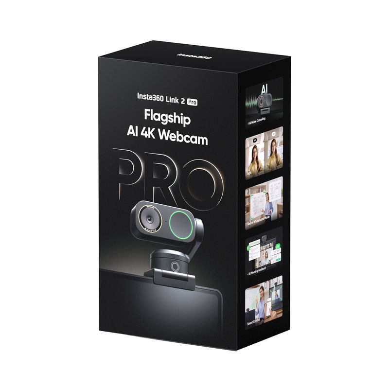 Package contains | Insta360 Link 2 Pro 4K AI webcam Suport magnetic Cablu USB-C Adaptor USB-C la USB-A Marker de recunoastere |