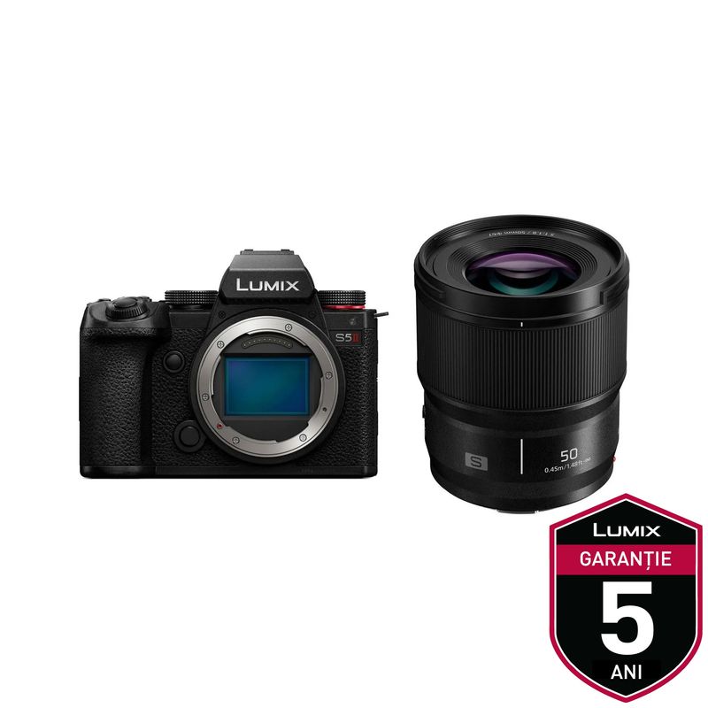 Package contains | Aparat foto Capac pentru corp Capac pentru Hot Shoe Capac pentru conectorul gripului pentru acumulator Curea de umar Acumulator Obiectiv LUMIX S 50 mm F1.8 Parasolar Capace spate si fata |