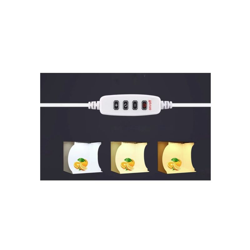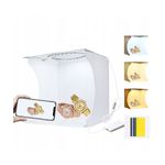 Package contains | 1 x Cub foto principal cu panou LED inclus 1 x Geanta moale de transport 1 x Fundal negru 1 x Fundal alb 1 x Fundal galben 1 x Fundal rosu 1 x Fundal albastru 1 x Fundal verde 1 x Manual de utilizare |