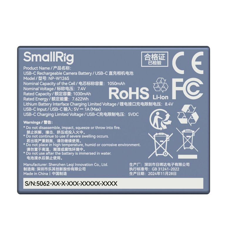 Package contains | Baterie reincarcabila NP-W126S USB-C Cablu de incarcare USB-A la USB-C 0.6m Manual de utilizare |