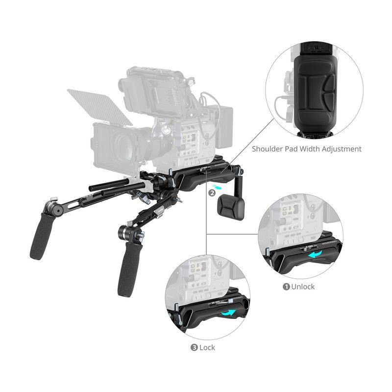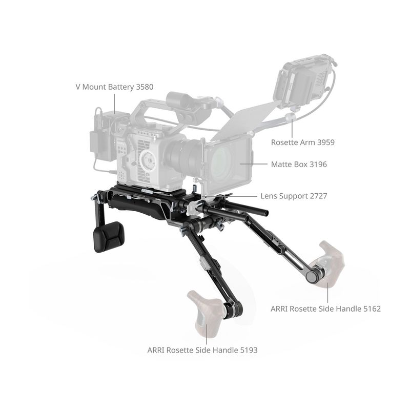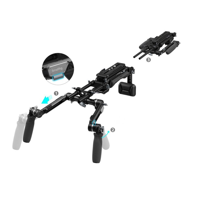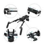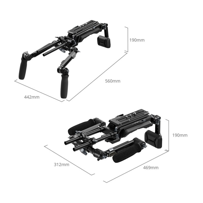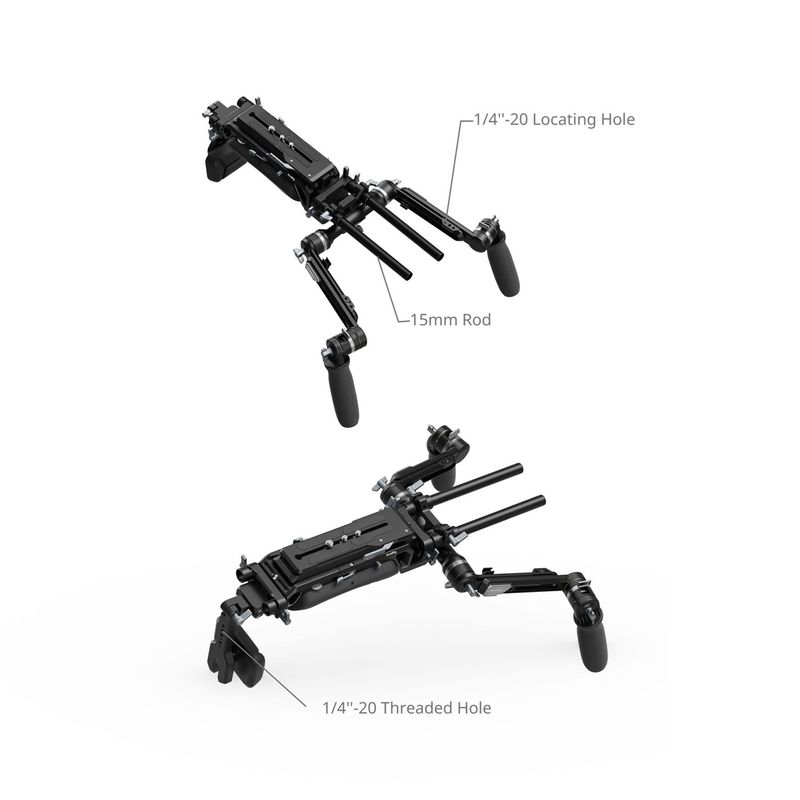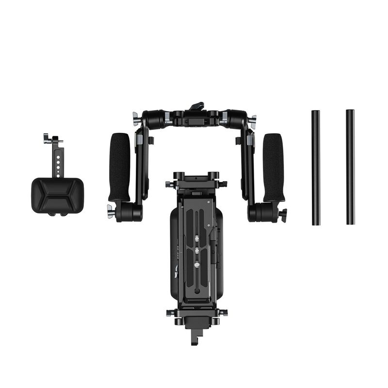 Package contains | Suport pentru umar Suport pentru spate Placa cu eliberare rapida 2 x brat telescopic de extensie 2 x tija de 15 mm 2 x surub 1/4 1 x surub 3/8 |