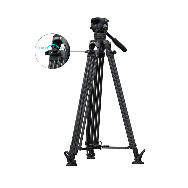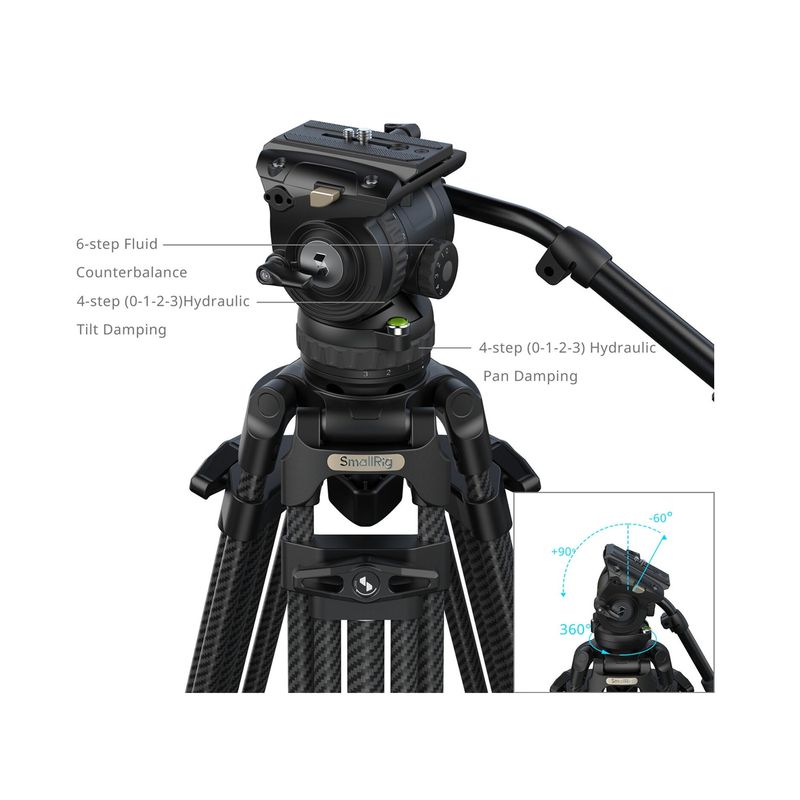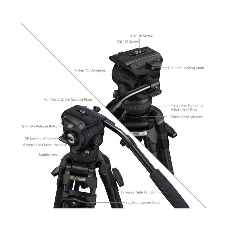 Package contains | SmallRig FreeSpeed FSD16 Heavy-Duty Carbon Fiber Tripod cu cap fluid Placa quick release Surub 1/4"-20 Surub 3/8"-16 Buton de fixare (tie-down) Maner telescopic pentru pan Clema pentru telefon Cheie Allen Geanta de depozitare |
