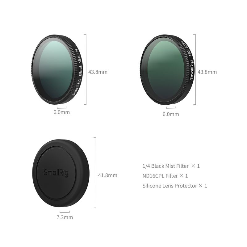 Package contains | Filtru black mist efect 1/4 x 1 Filtru ND16 & CPL x 1 Laveta de curatare x 1 Capac din silicon pentru lentila x 1 |