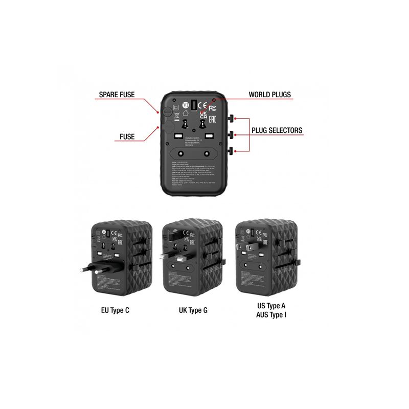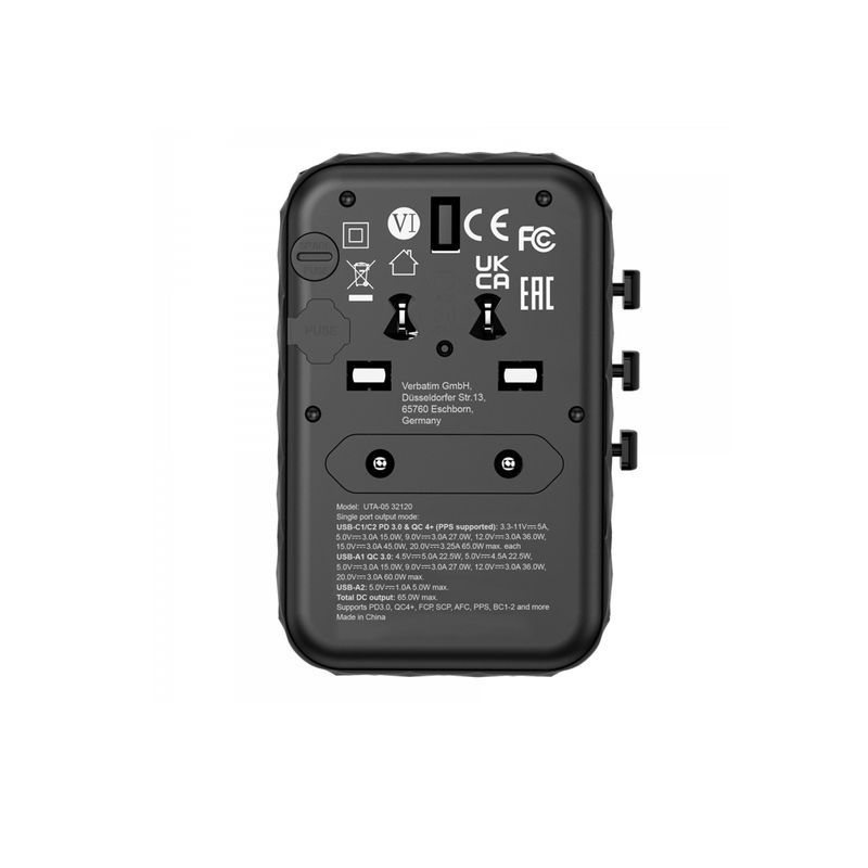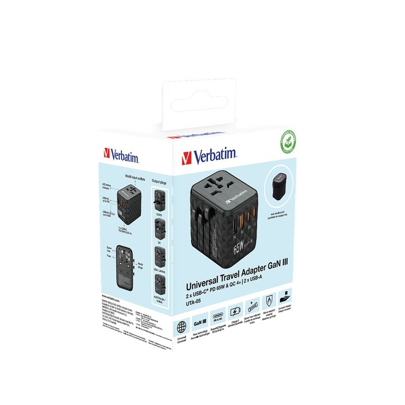 Package contains | Verbatim UTA-05 Adaptor Universal de Calatorie GaN III 65W 2 x USB-C 2 x USB-A PD QC 4+ Negru Ghid de pornire rapida Husa de transport |