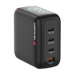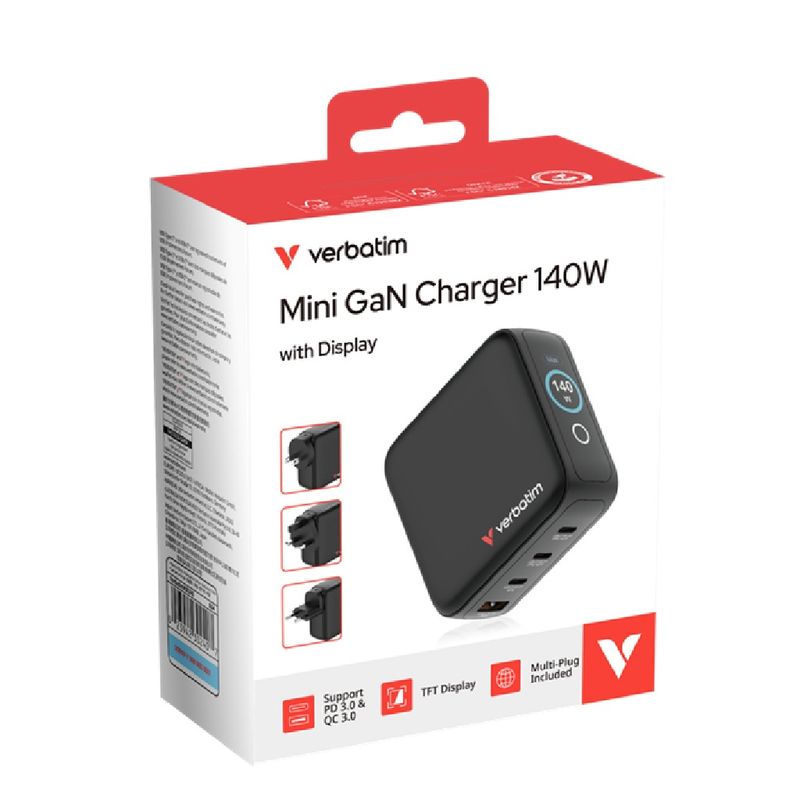 Package contains | Verbatim Mini GaN Charger 140W cu display Stechere interschimbabile EU, UK si US Ghid de pornire rapida |