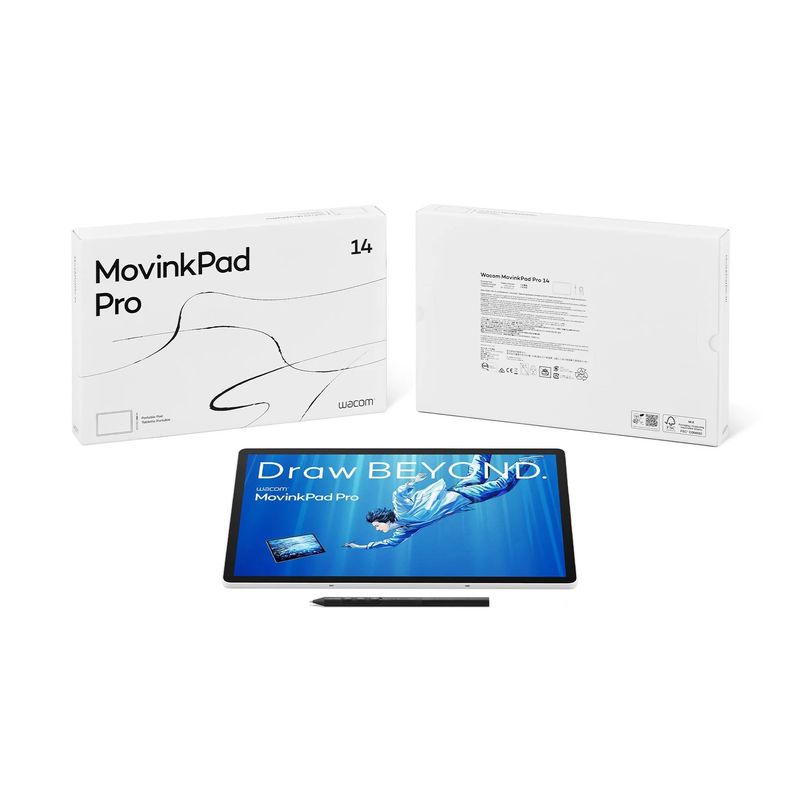 Package contains | 1x Tableta Wacom MovinkPad Pro 14 1x Stylus Wacom Pro Pen 3 (Movink Edition) cu gripuri personalizabile 1x Suport pentru varfuri cu 3 varfuri (Carbon Shaft POM, Felt, POM) 1x Cablu USB Type-C (1 m) 1x Unealta pentru card micro-SD 1x Fisa de reglementari + ghid de pornire rapida |